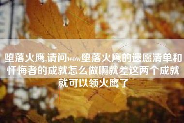 1、堕落火鹰,请问wow堕落火鹰的遗愿清单和忏悔者的成就怎么做啊就差这两个成就就可以领火鹰了?遗愿清单,拉着BOSS走过几个地方然后击杀,忏悔者需要6个人,你可以去集合石找找,有人做这个成就的。2、是什么让你一直坚持打CF?《穿越火线》(C...